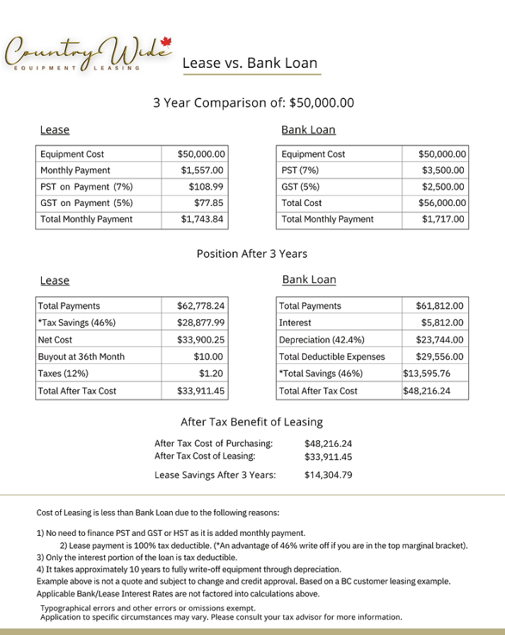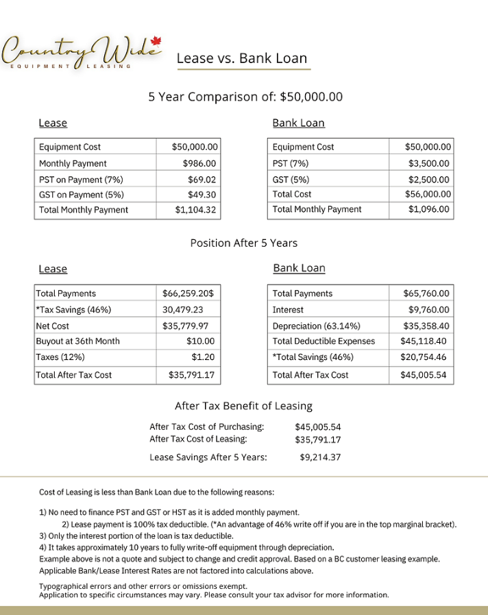 Check out this side-by-side comparison of a $50,000 equipment lease vs. a bank loan. Notice the position after the term is complete. This is why all businesses should at the very least, lease a portion of their fleet or commercial equipment. Don't take it from us, consult your accountant today! (Click image below to enlarge)